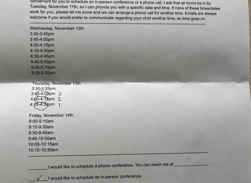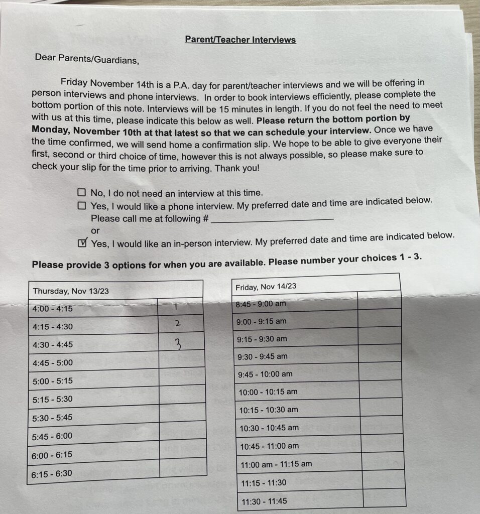 1~2週間ほど前に、面談希望日を提出するプリントが配られました。それに第1希望~第3希望まで選択して提出しました。