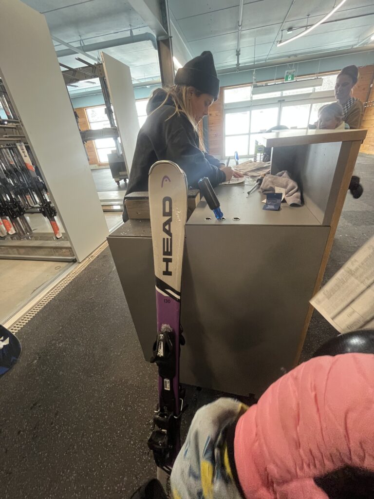 ここがレンタルの建物。右側がレンタル、左側はリターン。お姉さんがスキーシューズにピッタリ合うようスキー板を調節してくれます。ここでももたもたして1PMすぎ。