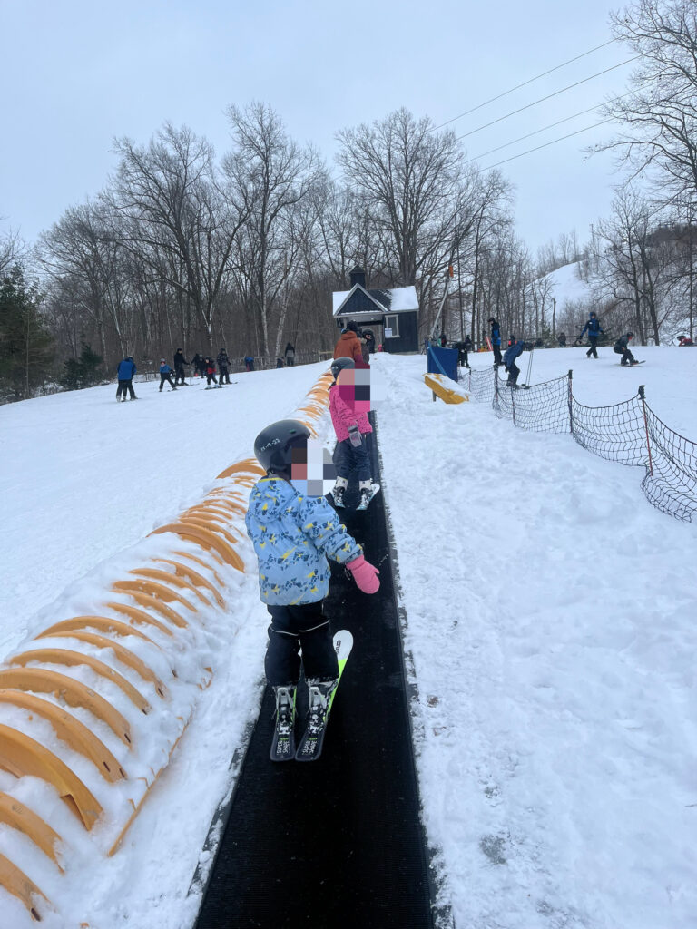 私たち初心者なので初心者用ヒルからスタート。スキーを履いて、リフト(というよりベルトコンベア?)に乗って上へ。あとは慣れるまで滑るだけ。