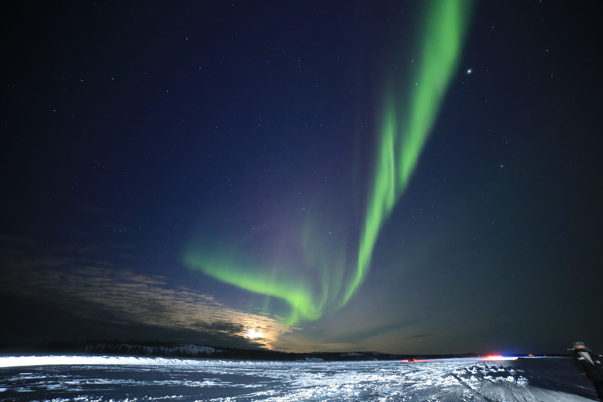 オーロラが現れる条件としては3つ、夜であること、人工の光がないこと、晴天であることだそうです。オーロラは光なので明るすぎる昼間は見えません。夏は夜が短く、イエローナイフなど高緯度では昼が長くオーロラが見にくくなります。人工の光(Light Pollutionと呼ばれています)もオーロラの敵。私たちのツアーでもオーロラを見るときには必ず湖などまわりに街明かりがないところに行きました。さらに晴天であることも大事、天候が雨や曇りや雪では雲がオーロラよりも低くにあり全く見ることができません。