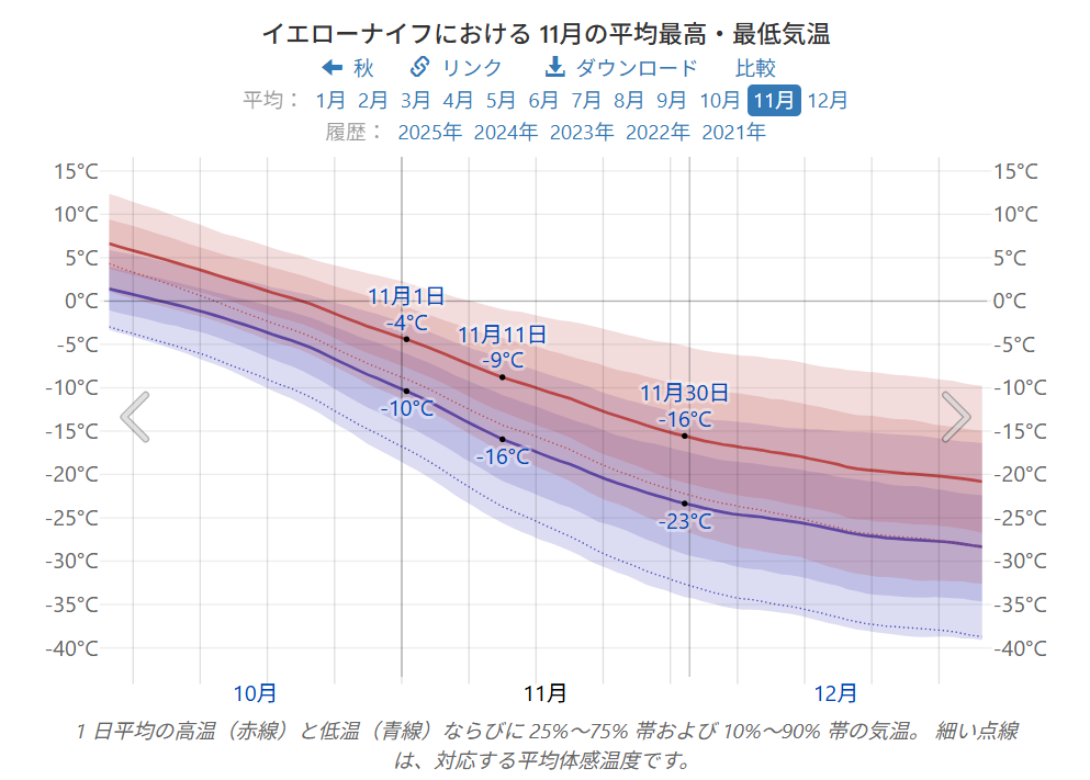 結論としては、 「小さい子がいるなら一番無難」な時期と言えそうです。参考までに、イエローナイフ11月の平均気温はこんな感じ(上旬なら気温がまだまし)