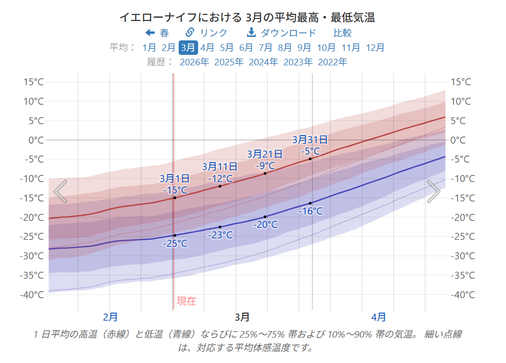 この時期、「雪体験も楽しめる子連れオーロラ」に最適と言えそうです。3月のイエローナイフ気温はこんな感じ。(気温的には3月下旬がおすすめ)