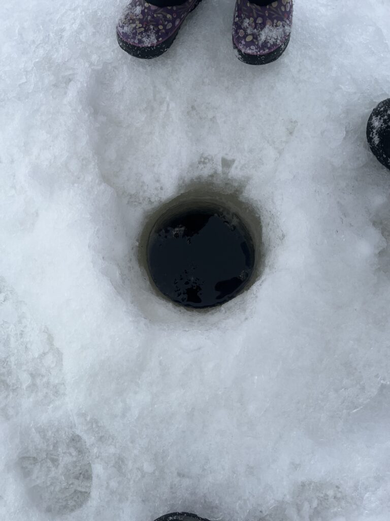 もちろん、こうしないと分かりません。(素人にはできませんね。。笑)Mickyさんはもちろん氷に穴をあけるドリル、「アイスオーガー」を持っていましたので手際よく穴をあけていきました。誰かがすでに開けた穴で氷の厚さを知ることもできます。こんな感じ。