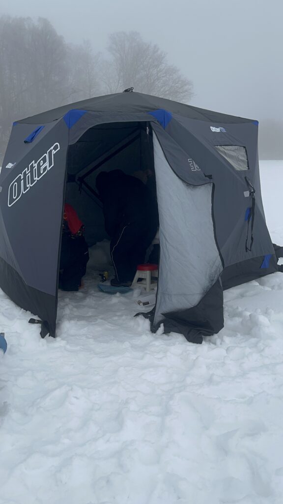 私たちがアイスフィッシングに行った日は最低気温-3度、最高気温4度でしたが、氷の上に立ち、ずっと外にいて風に吹かれているととっても寒い。足も手もしびれてきます。そこで、Mickyさんが用意してくれたのがテント。一人でも立ち上げられるもので、床部分はないもの。そこにポータブルヒーター(ガスボンベで温風がでるもの)もつけてくれました。