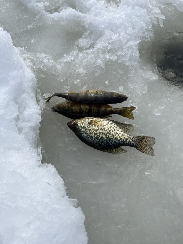 釣れた魚がこんな感じ。Chat GPTによると下の1匹がブラッククラッピー・上の2匹がイエローパーチという魚。この組み合わせ、オンタリオのアイスフィッシング定番の魚たちだそうです。